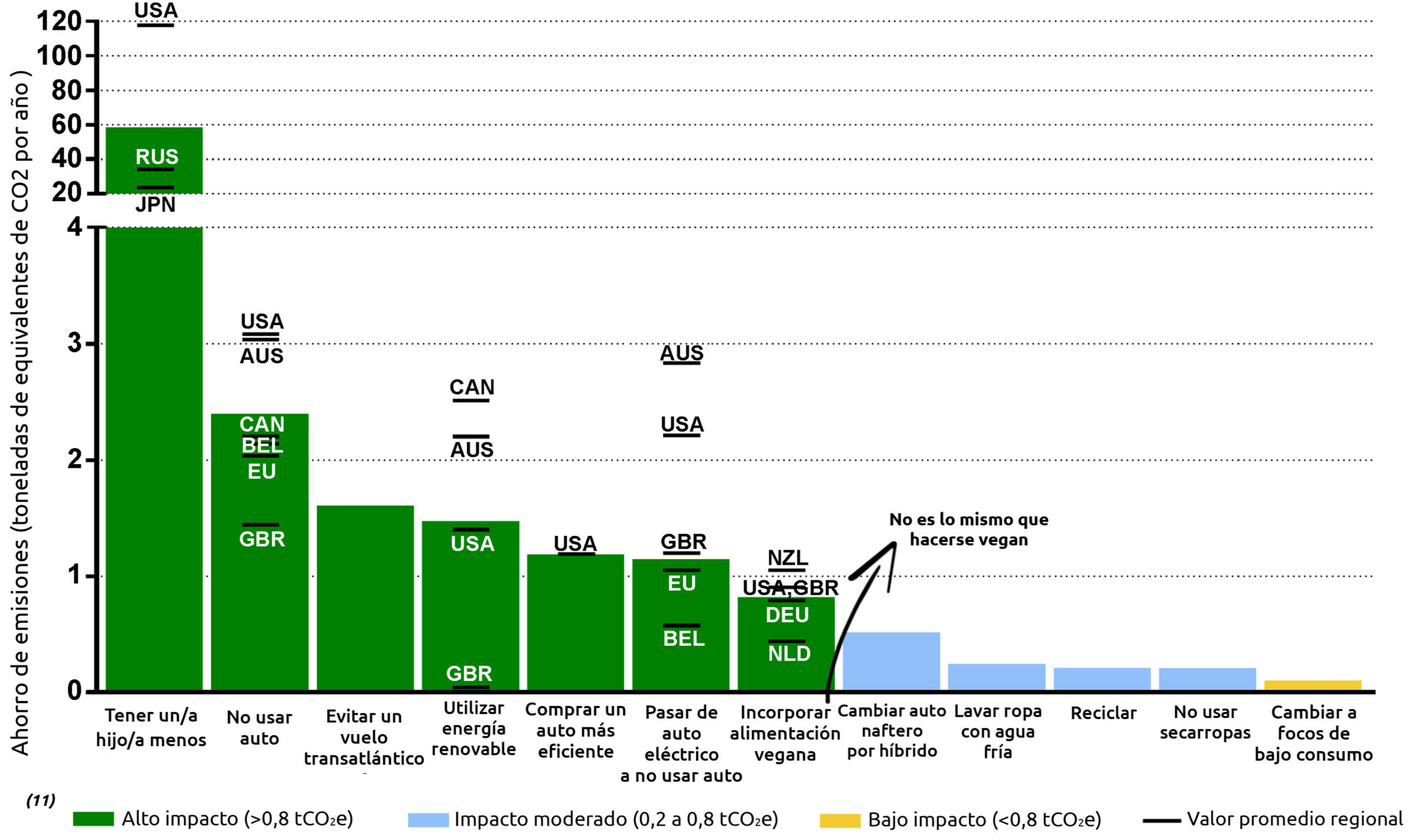 Este gráfico muestra distintas acciones y el ahorro de emisiones anuales de CO2e(12) asociado a ellas.Como se puede ver, hay tanta diferencia entre tener un/a hijo/a menos y cualquier otro accionar, que es necesario hacer un corte en el gráfico y cambiar de escala para poder ver todos los valores en la misma imagen, ya que el primer valor es 16 veces más grande que el segundo.